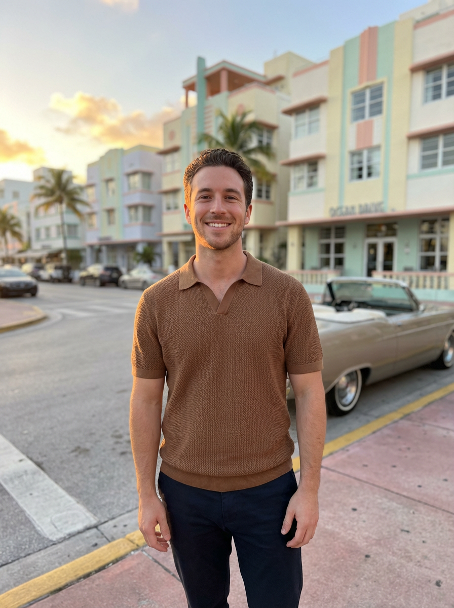 model on Ocean Drive, pastel art deco buildings, convertible car, glamorous Miami style, sunset