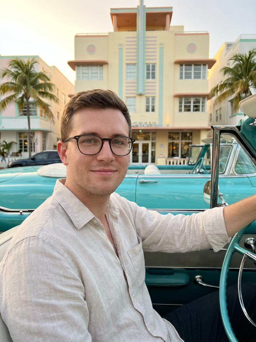 model on Ocean Drive, pastel art deco buildings, convertible car, glamorous Miami style, sunset