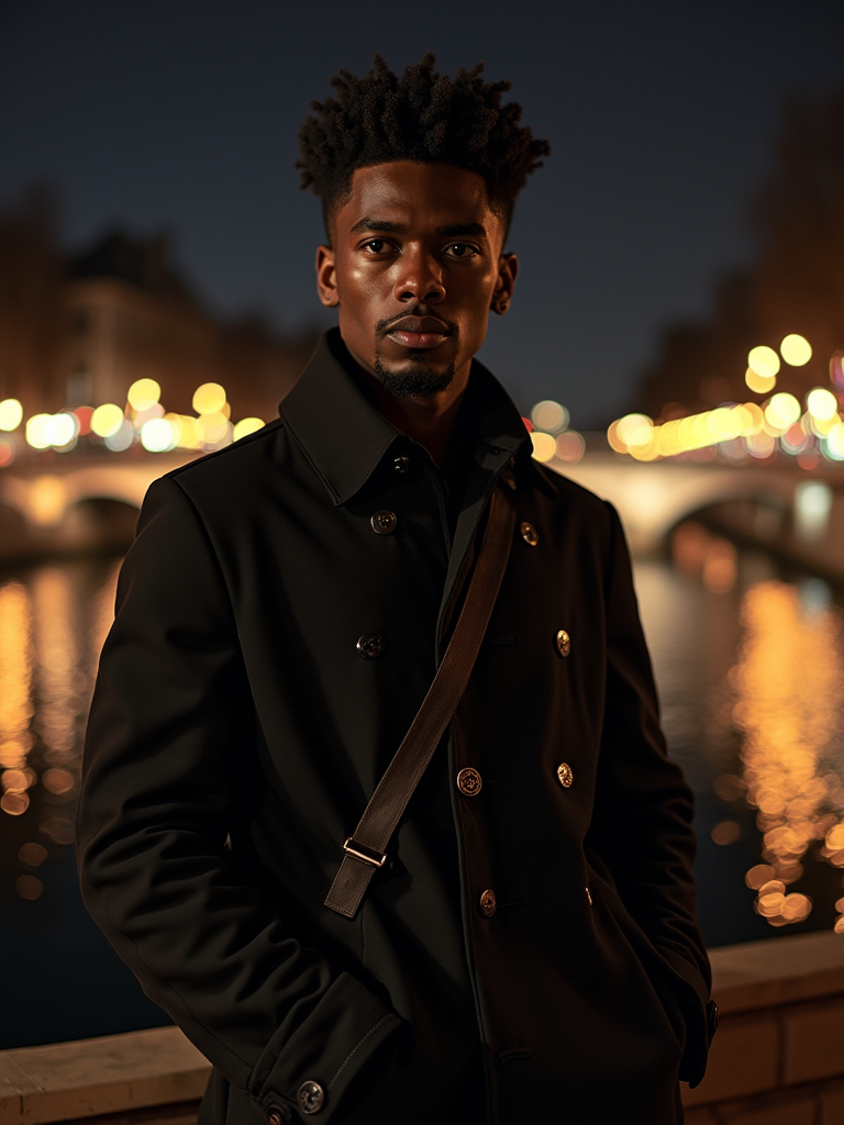 model on Pont Alexandre III at night, wearing a stylish dark outfit, Seine River and city lights in background