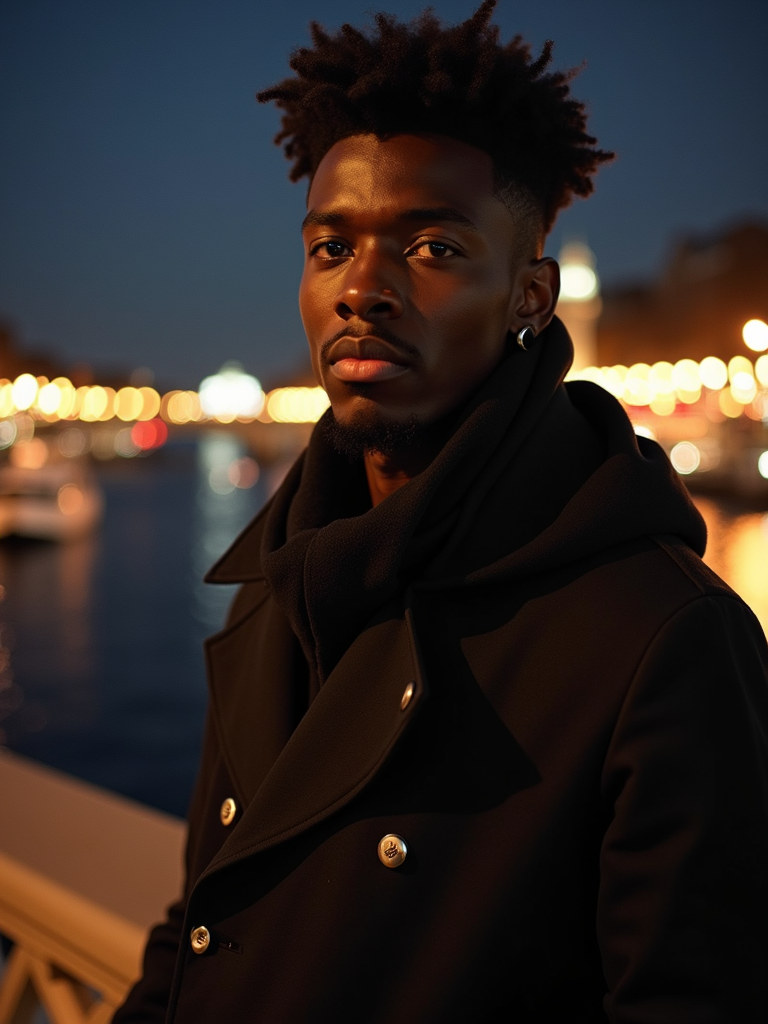 model on Pont Alexandre III at night, wearing a stylish dark outfit, Seine River and city lights in background