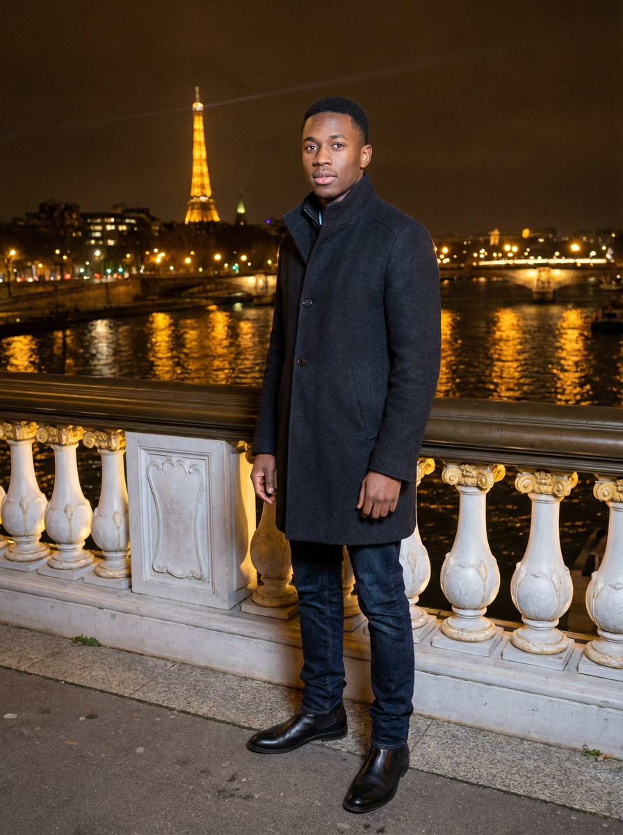 model on Pont Alexandre III at night, wearing a stylish dark outfit, Seine River and city lights in background