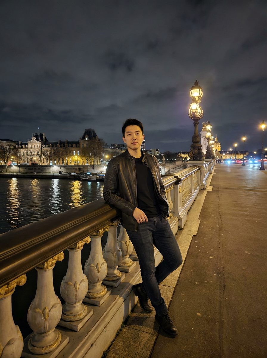 model on Pont Alexandre III at night, wearing a stylish dark outfit, Seine River and city lights in background