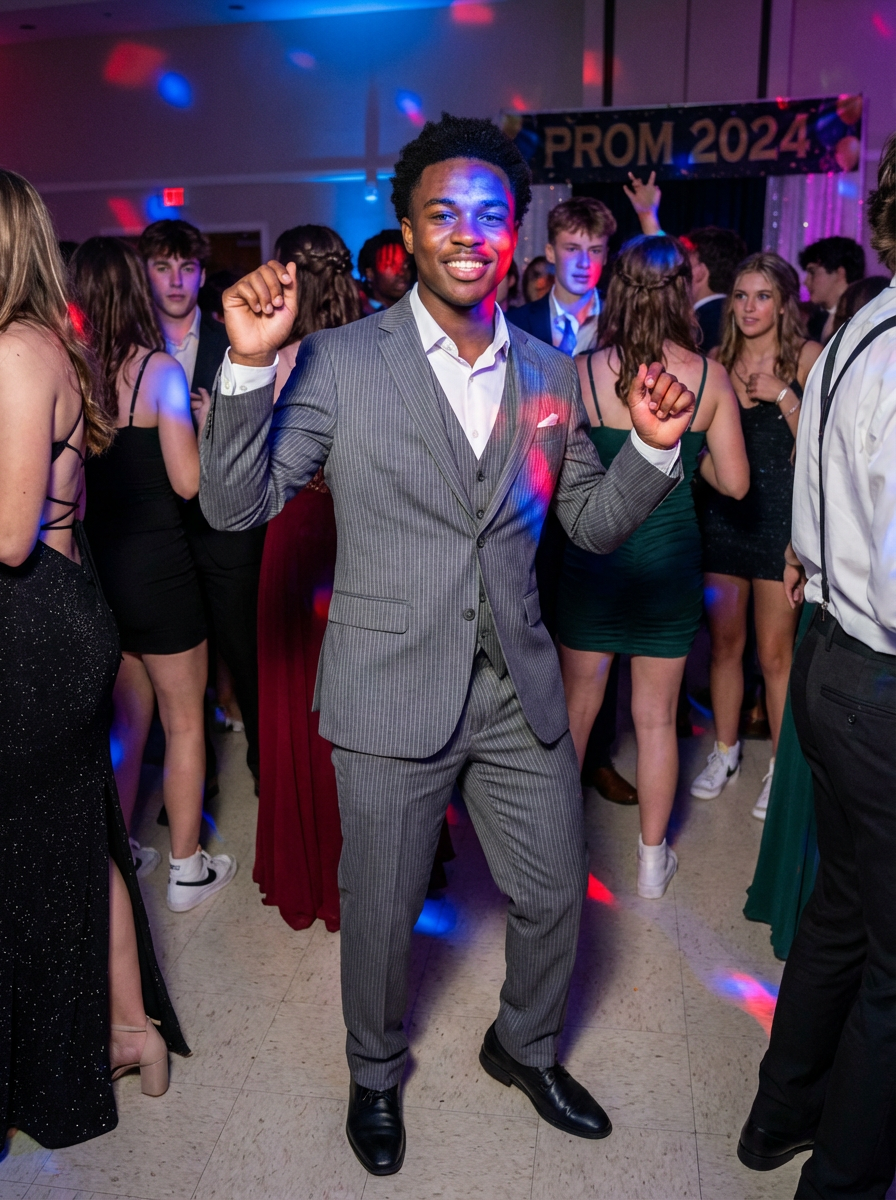 model on prom dance floor, dancing confidently, DJ lights, festive atmosphere