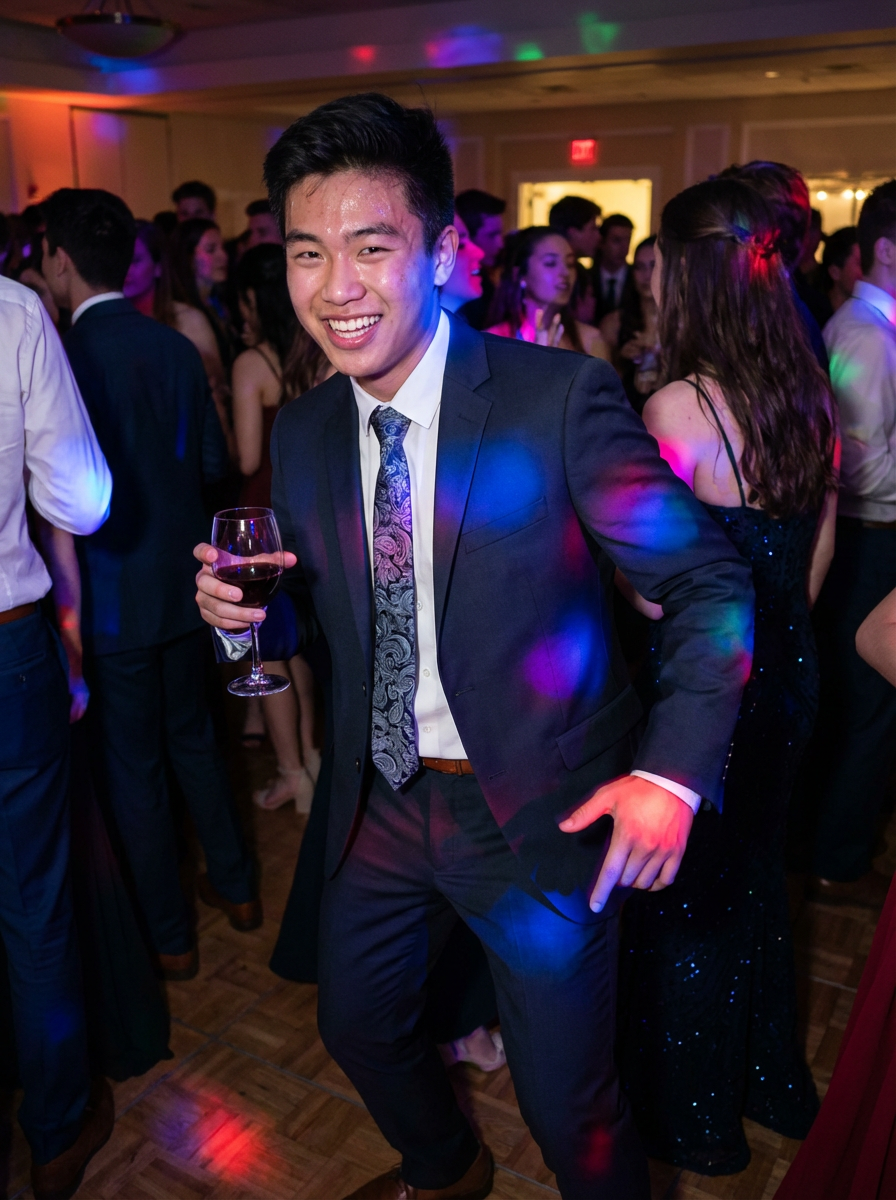 model on prom dance floor, dancing confidently, DJ lights, festive atmosphere