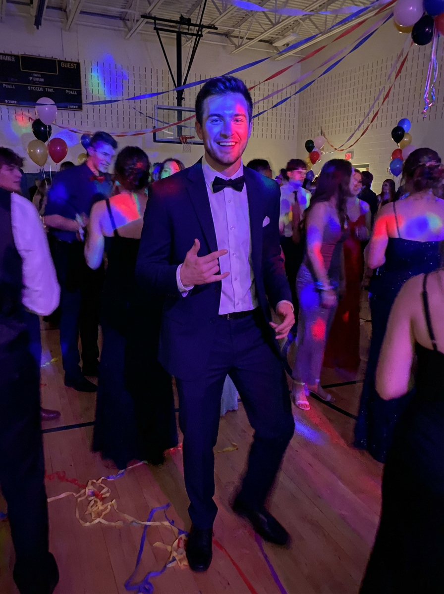 model on prom dance floor, dancing confidently, DJ lights, festive atmosphere
