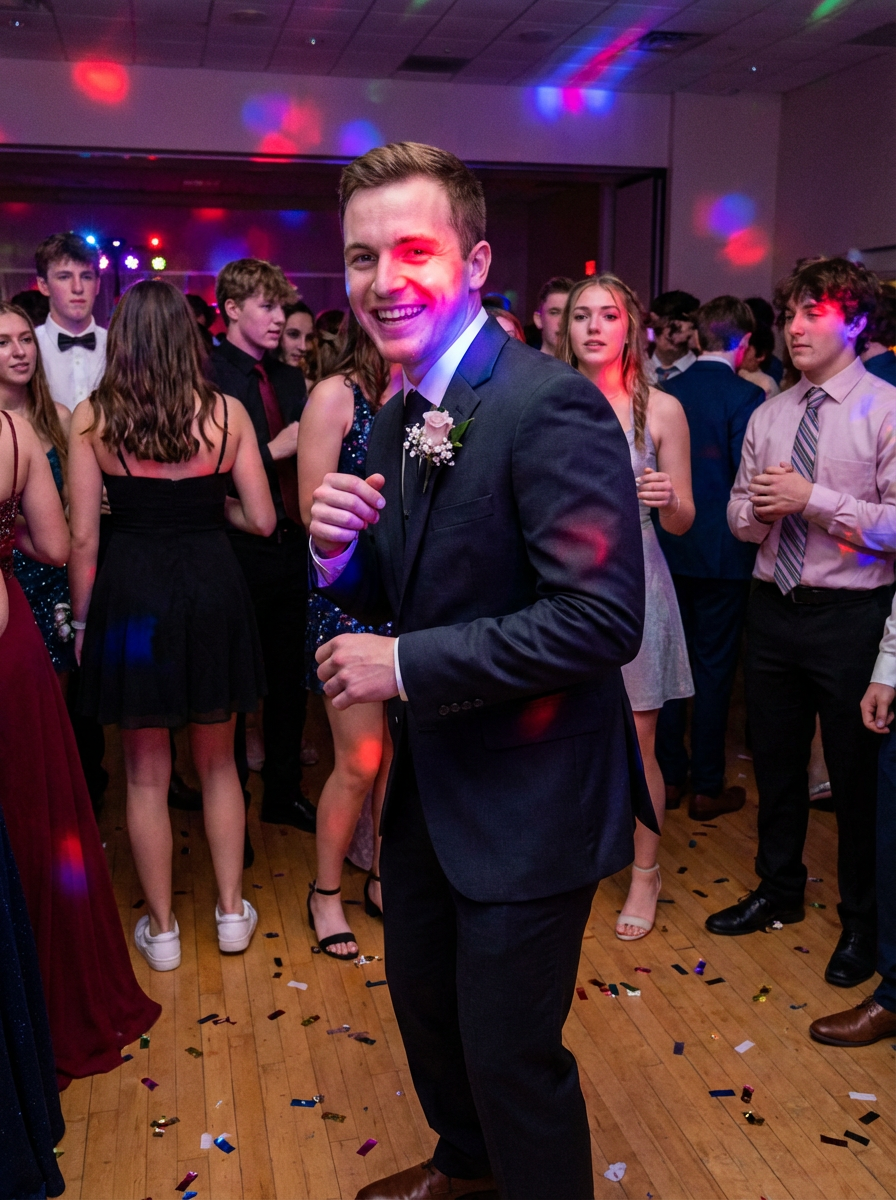 model on prom dance floor, dancing confidently, DJ lights, festive atmosphere