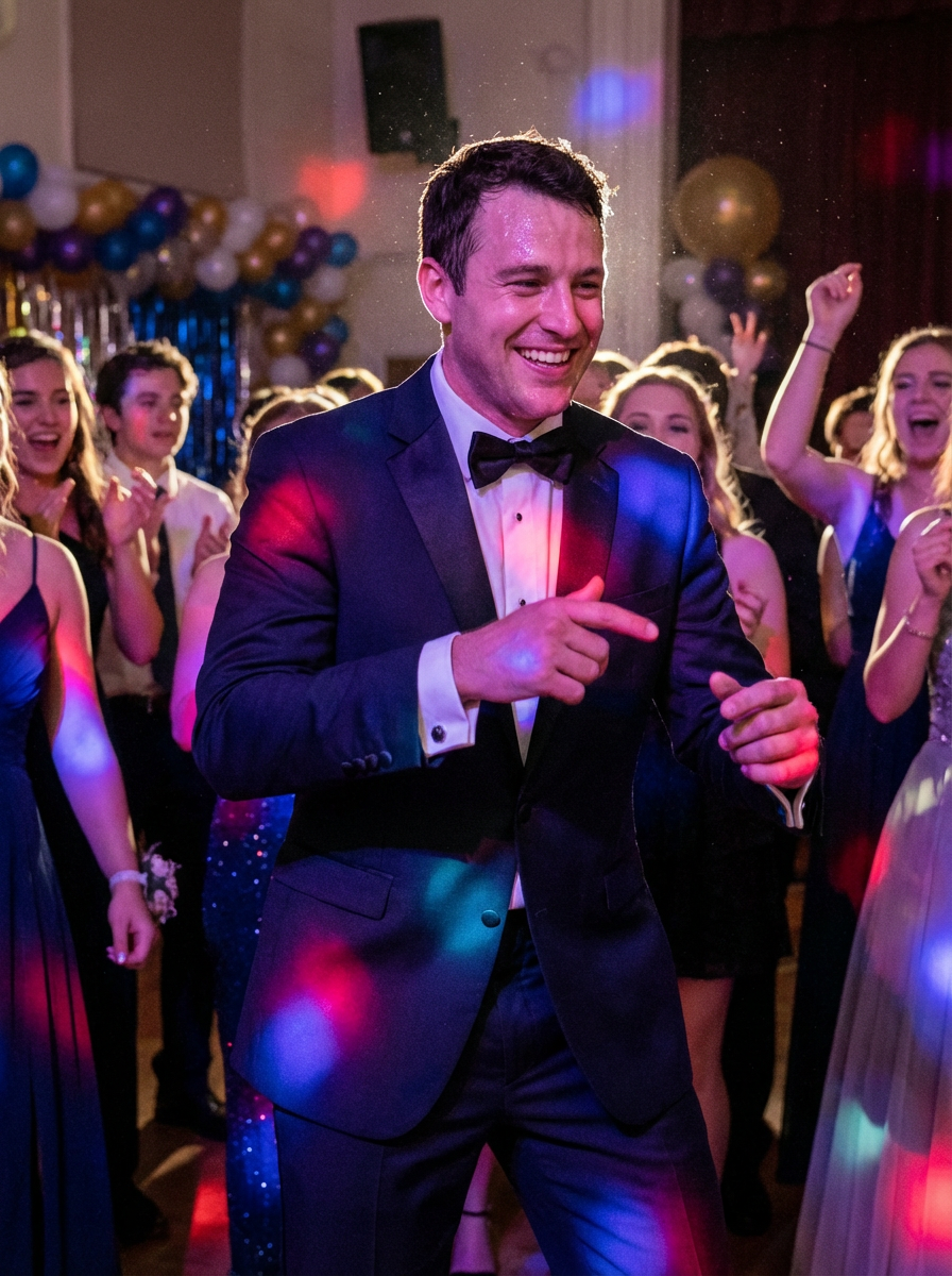 model on prom dance floor, dancing confidently, DJ lights, festive atmosphere