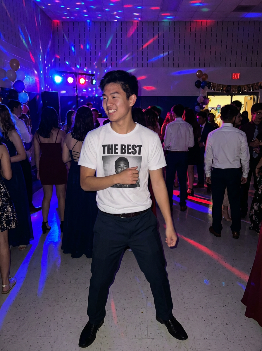 model on prom dance floor, dancing confidently, DJ lights, festive atmosphere