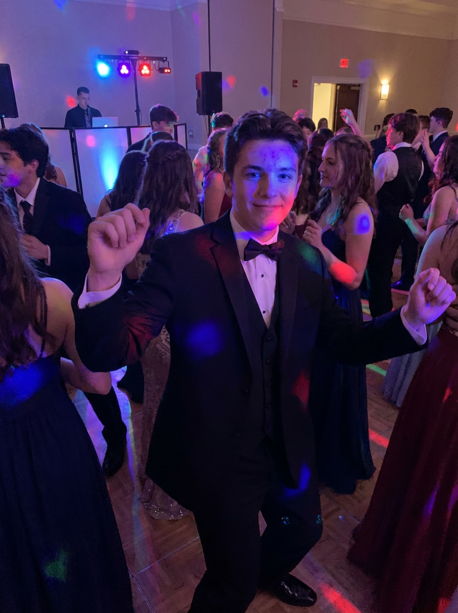 model on prom dance floor, dancing confidently, DJ lights, festive atmosphere
