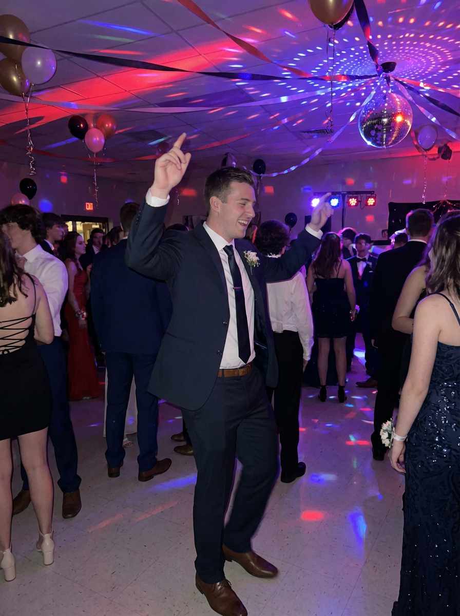 model on prom dance floor, dancing confidently, DJ lights, festive atmosphere