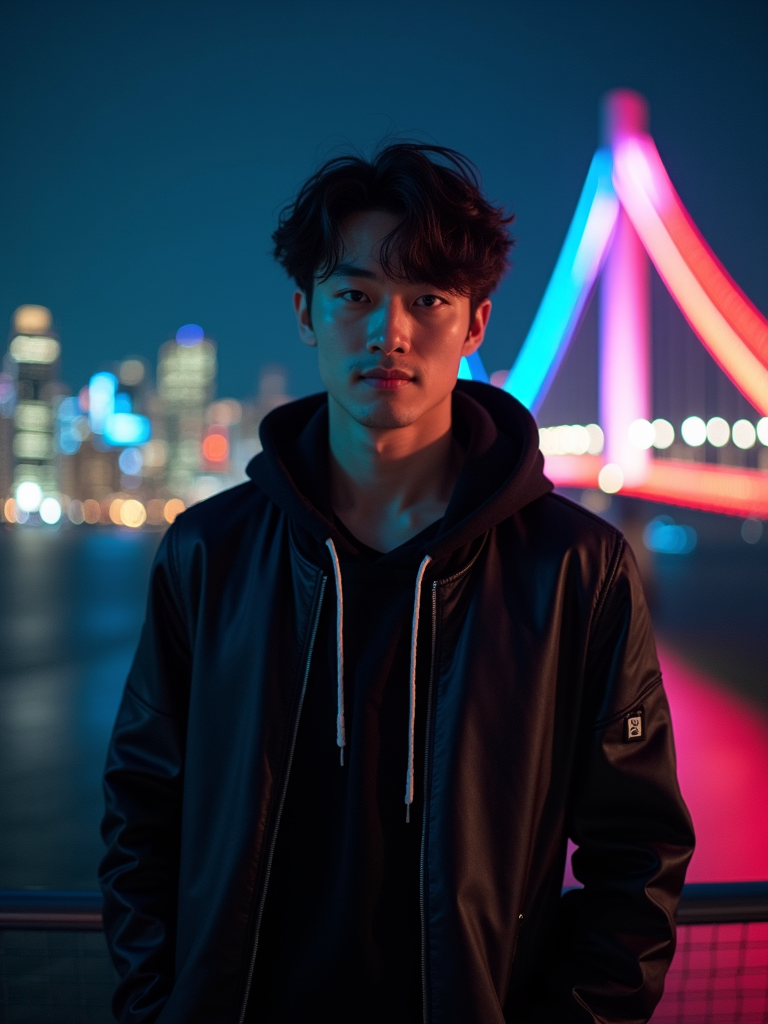 model on Rainbow Bridge at night, wearing a stylish dark outfit, Tokyo Bay and city lights in background
