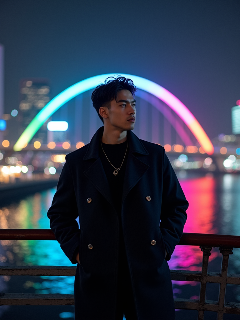 model on Rainbow Bridge at night, wearing a stylish dark outfit, Tokyo Bay and city lights in background