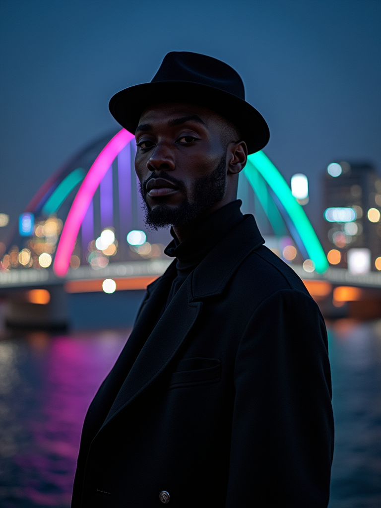 model on Rainbow Bridge at night, wearing a stylish dark outfit, Tokyo Bay and city lights in background