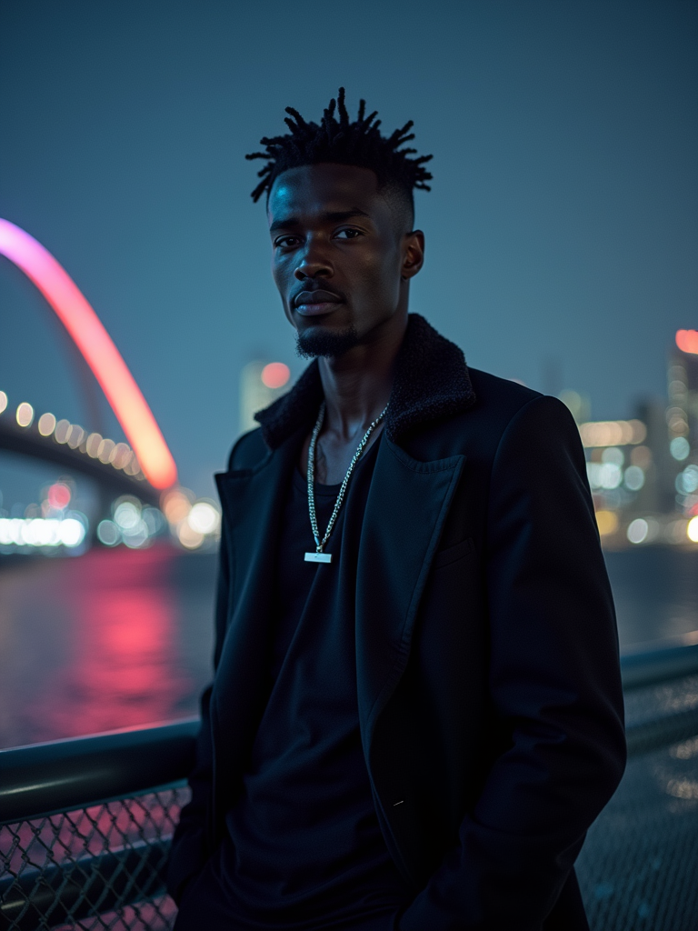 model on Rainbow Bridge at night, wearing a stylish dark outfit, Tokyo Bay and city lights in background