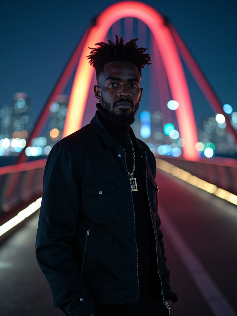model on Rainbow Bridge at night, wearing a stylish dark outfit, Tokyo Bay and city lights in background