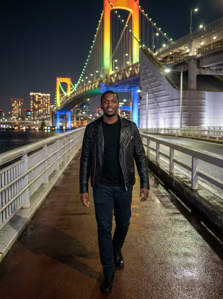 model on Rainbow Bridge at night, wearing a stylish dark outfit, Tokyo Bay and city lights in background