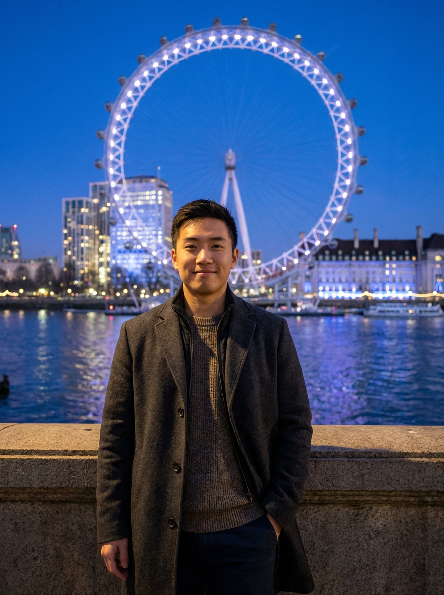 model on South Bank, London Eye and Thames, evening city lights, sophisticated outfit