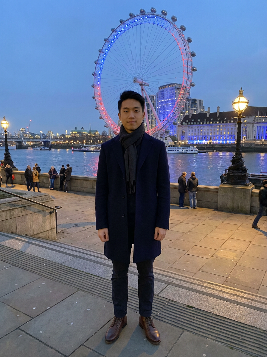 model on South Bank, London Eye and Thames, evening city lights, sophisticated outfit