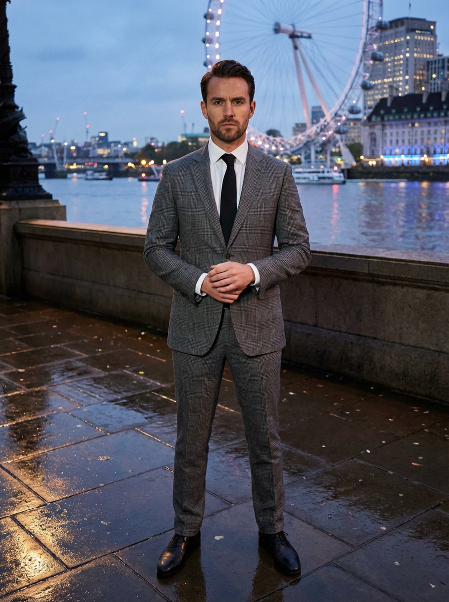 model on South Bank, London Eye and Thames, evening city lights, sophisticated outfit