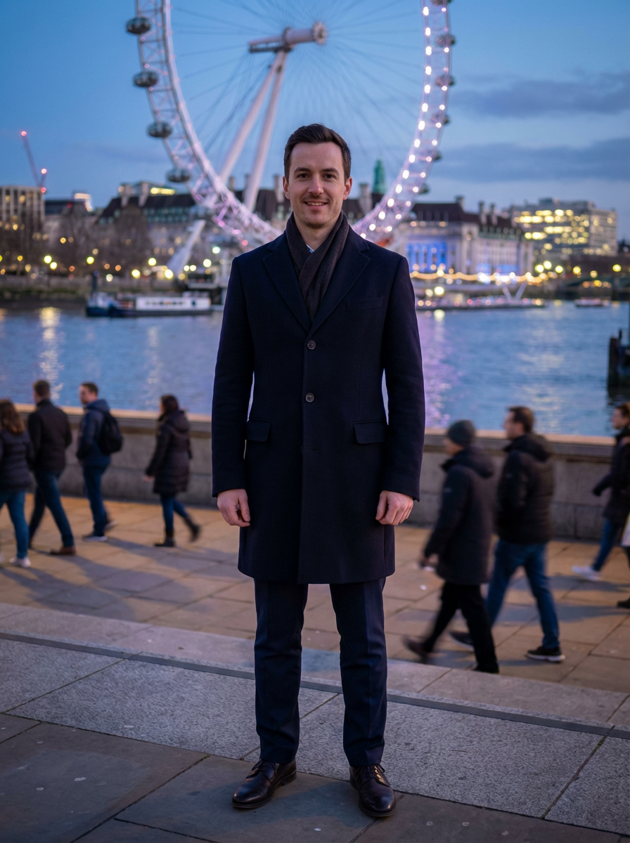 model on South Bank, London Eye and Thames, evening city lights, sophisticated outfit
