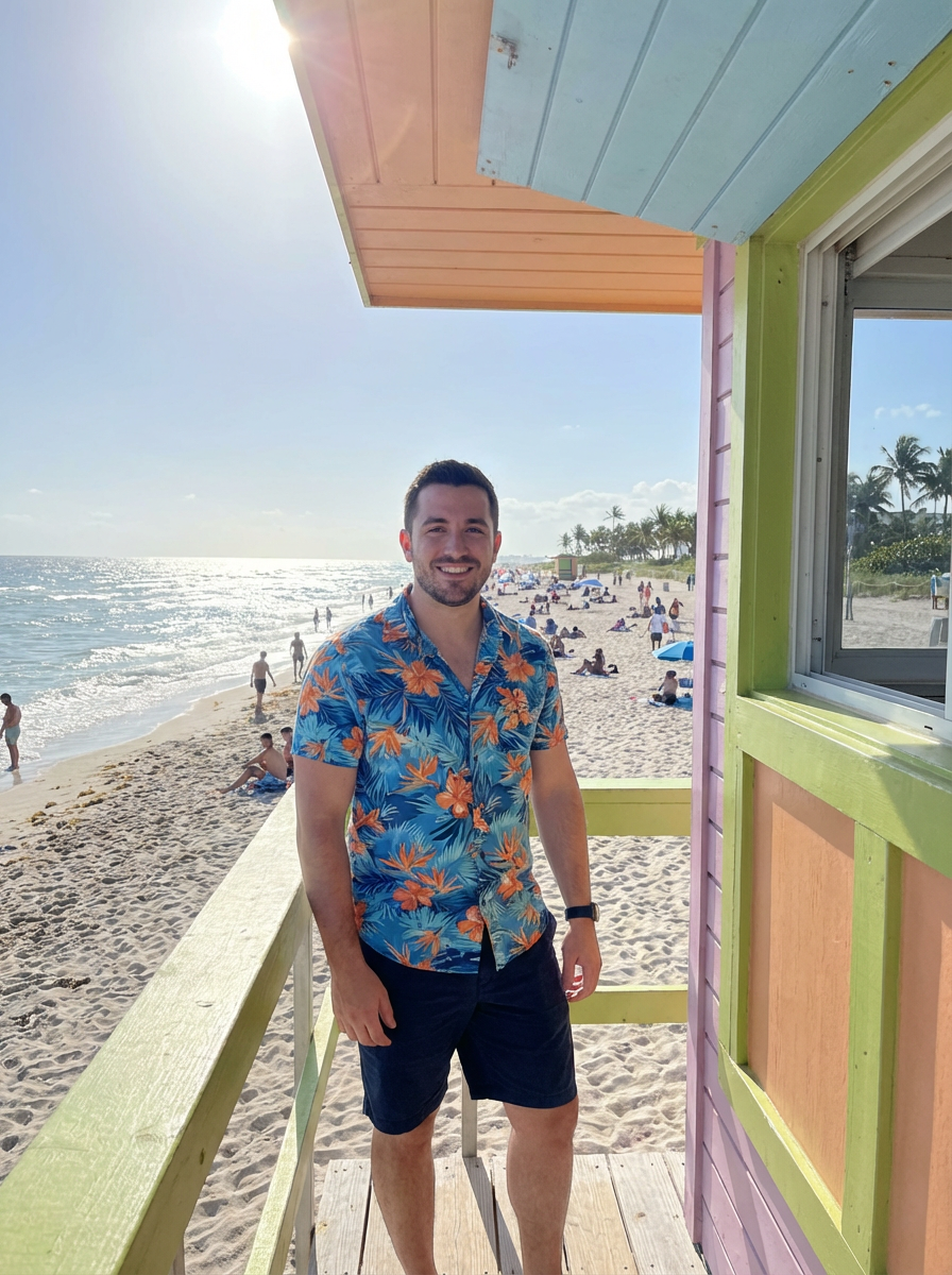 model on South Beach Miami, art deco lifeguard stand, tropical shirt, sunny beach day