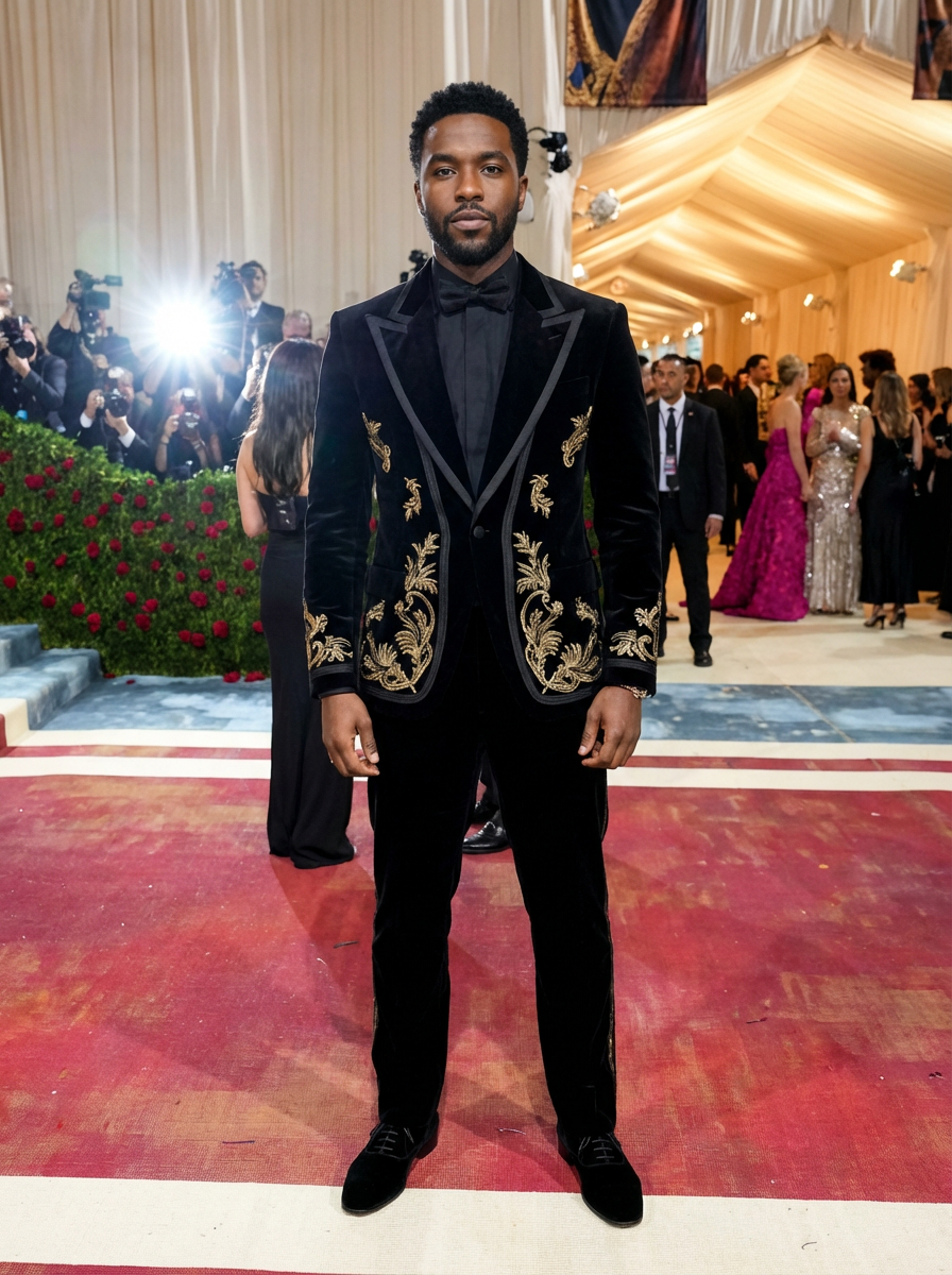 model on the Met Gala red carpet at the Metropolitan Museum of Art, wearing a bold designer tuxedo with unique details, camera flashes and celebrity attendees in background, elaborate Met Gala decorations visible