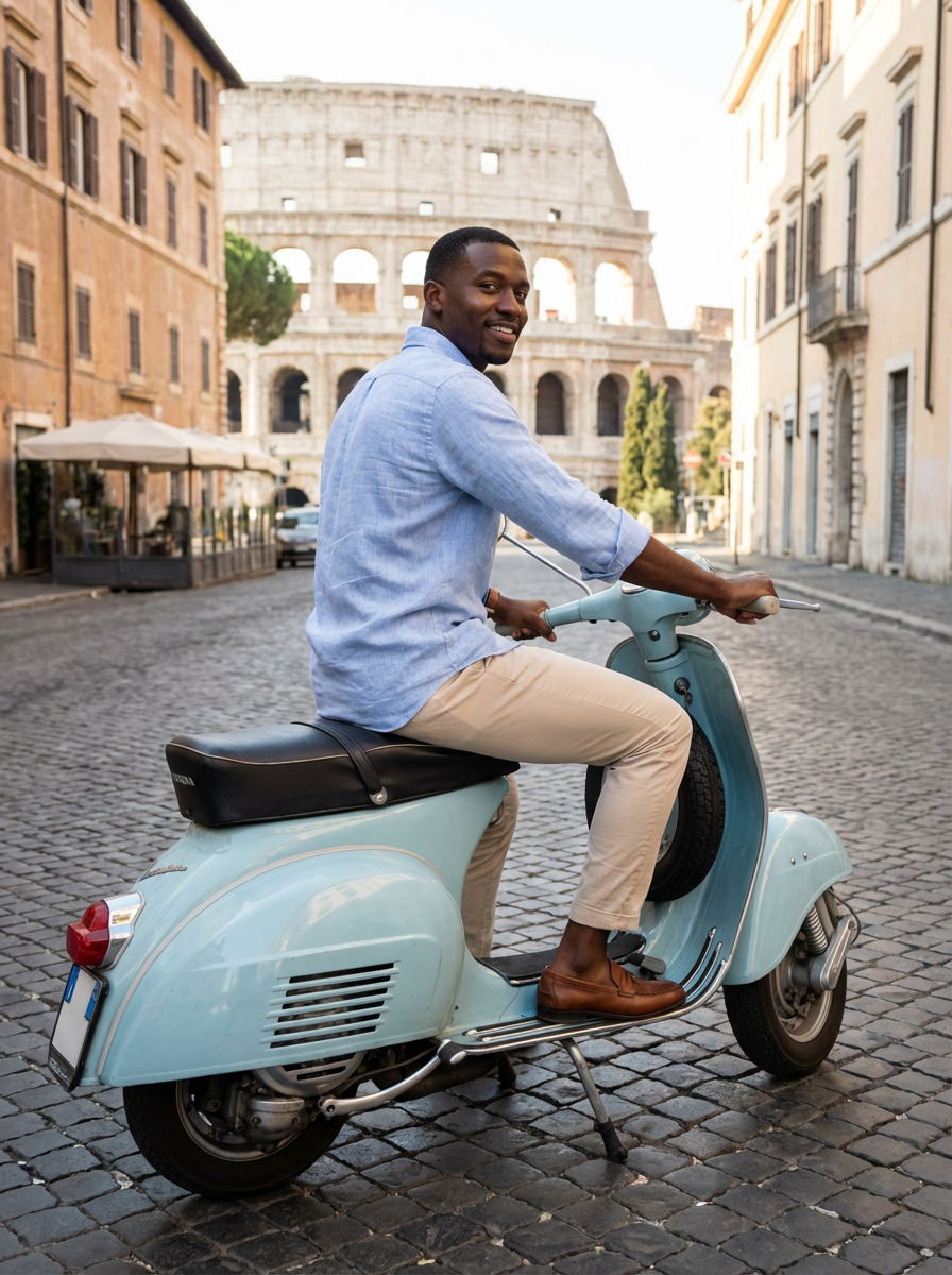 model on Vespa scooter, Roman Holiday aesthetic, casual Italian style, iconic scene