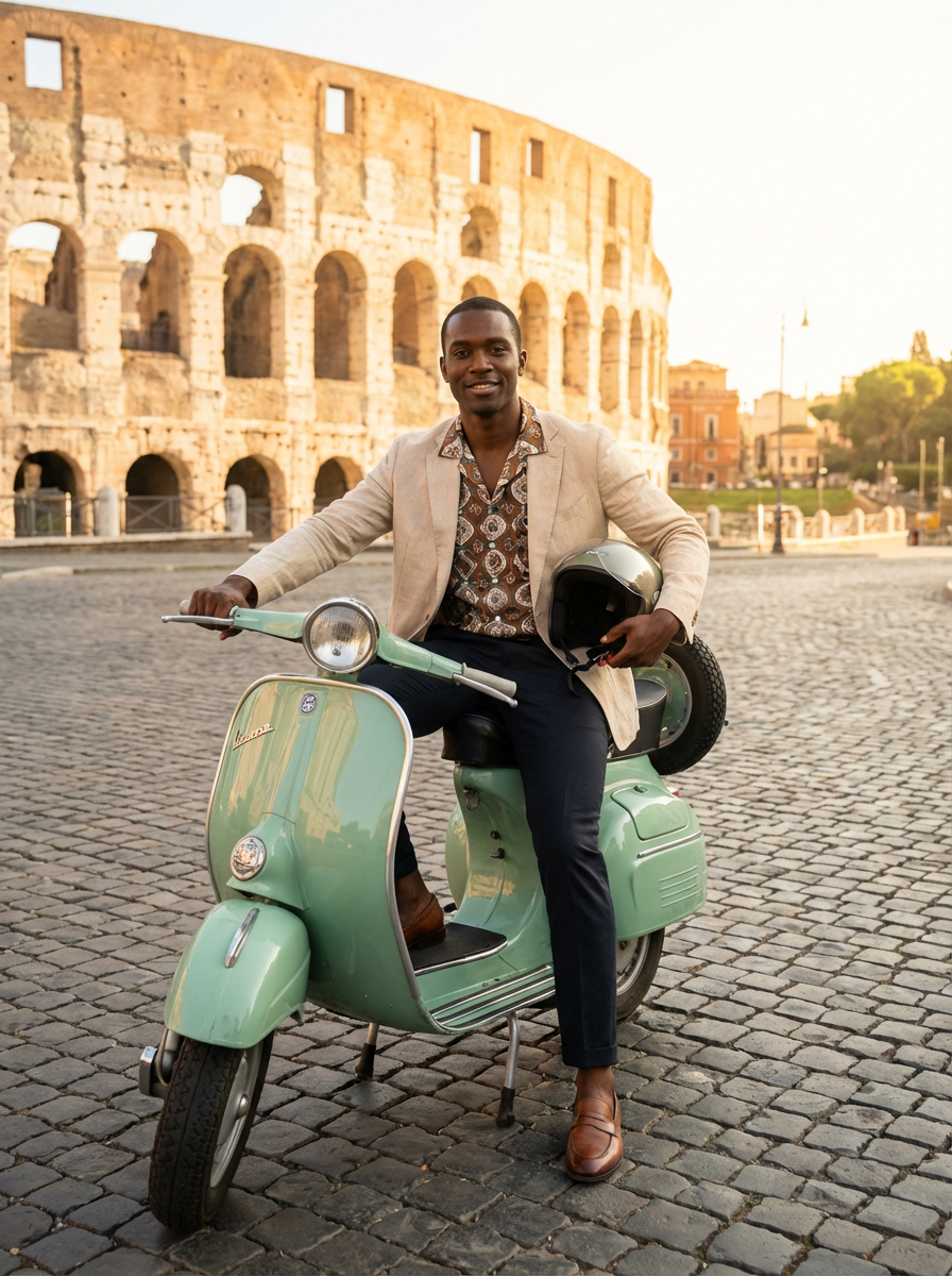 model on Vespa scooter, Roman Holiday aesthetic, casual Italian style, iconic scene