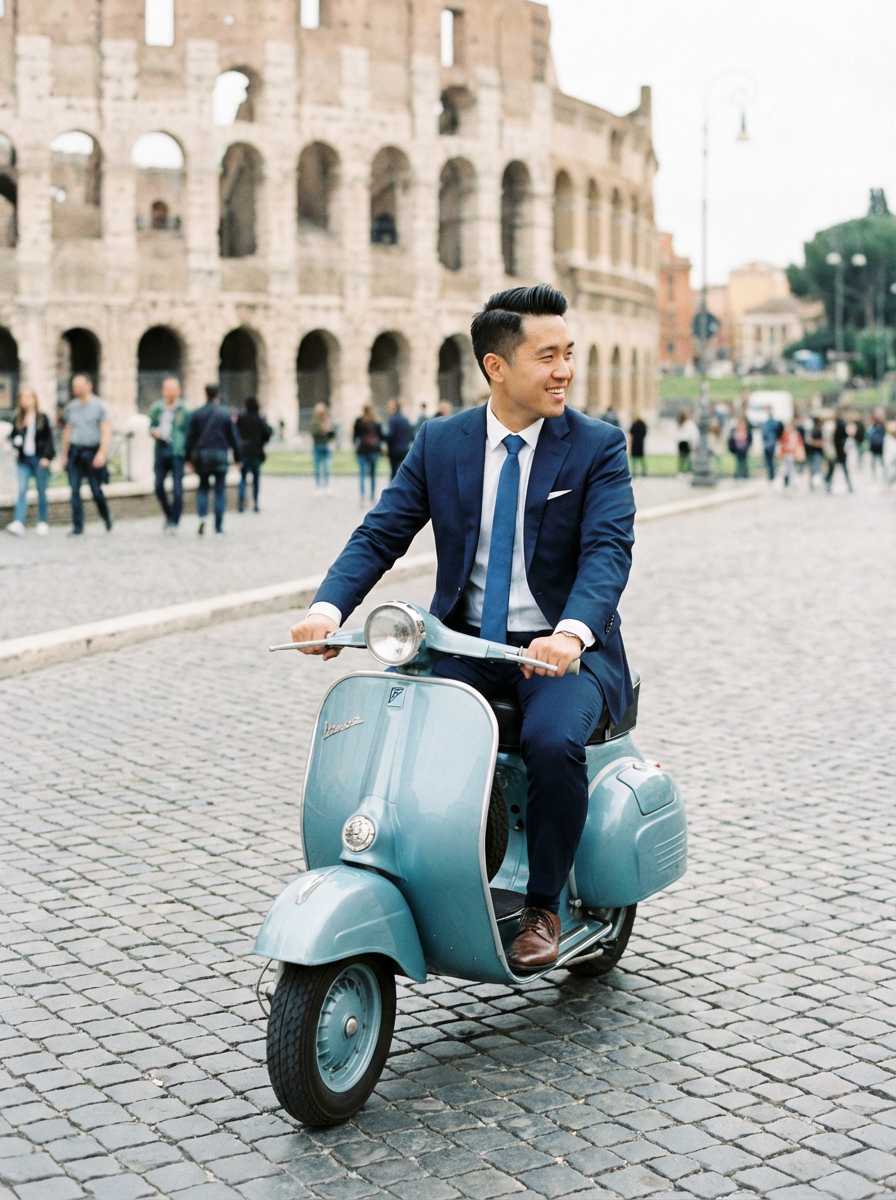 model on Vespa scooter, Roman Holiday aesthetic, casual Italian style, iconic scene