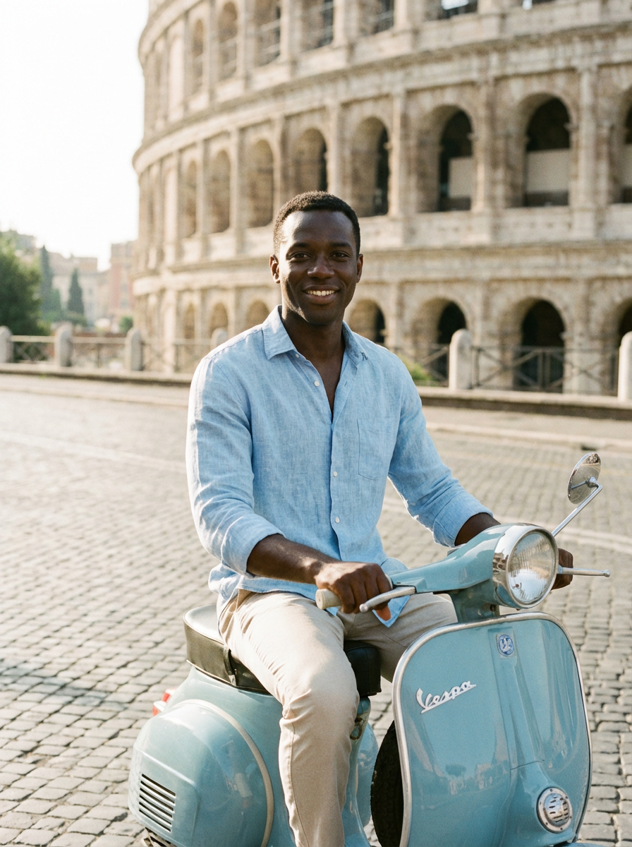 model on Vespa scooter, Roman Holiday aesthetic, casual Italian style, iconic scene