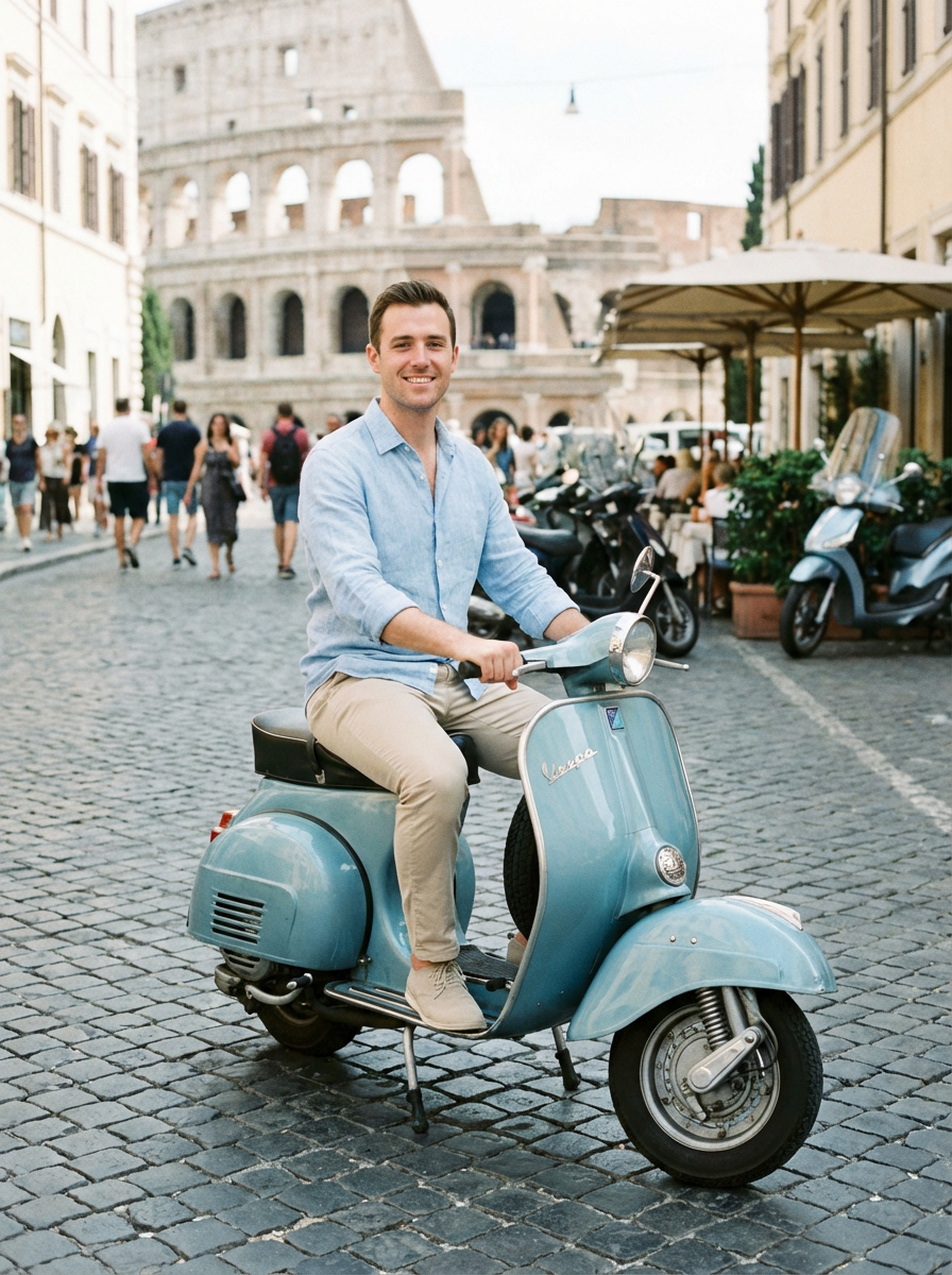 model on Vespa scooter, Roman Holiday aesthetic, casual Italian style, iconic scene