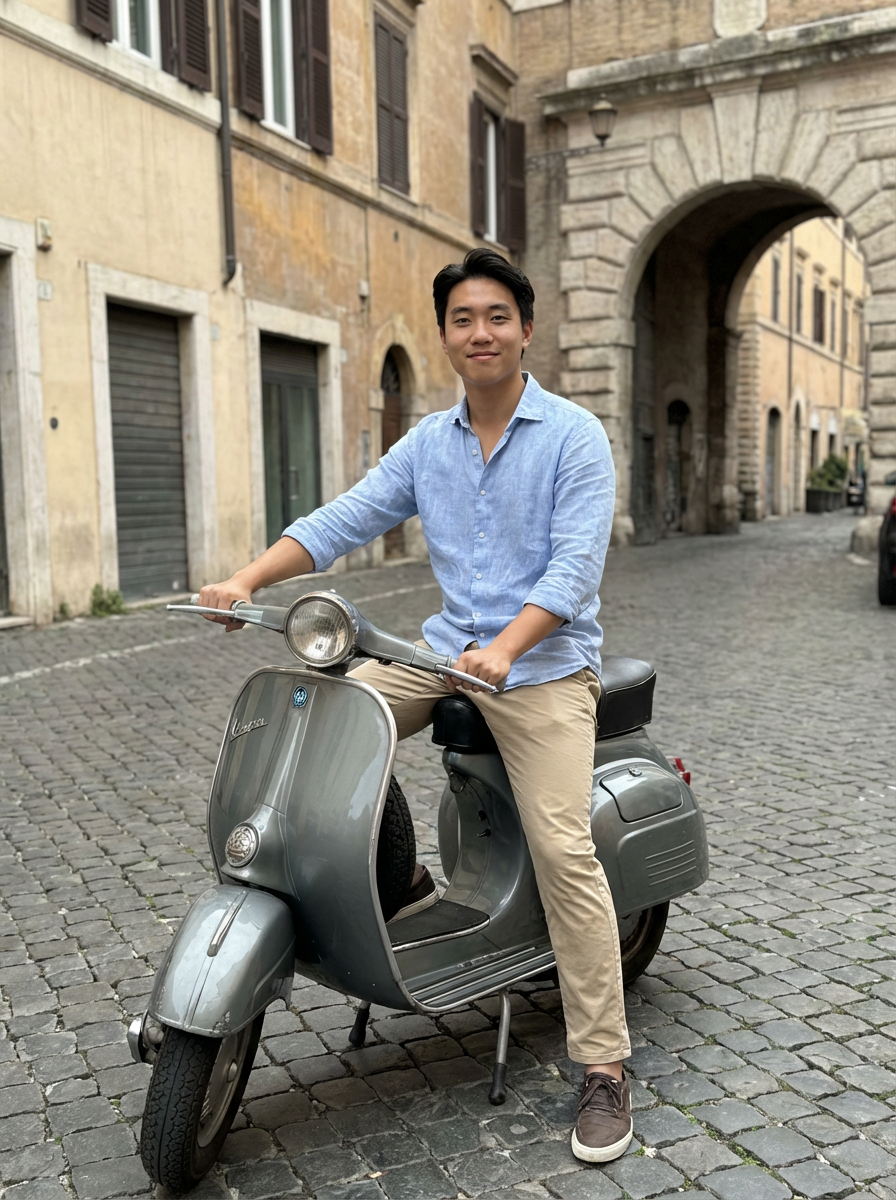 model on Vespa scooter, Roman Holiday aesthetic, casual Italian style, iconic scene