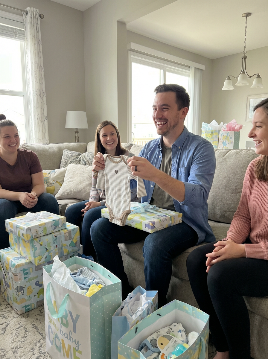 model opening baby shower gifts, cute baby items, surrounded by loved ones, joyful expression