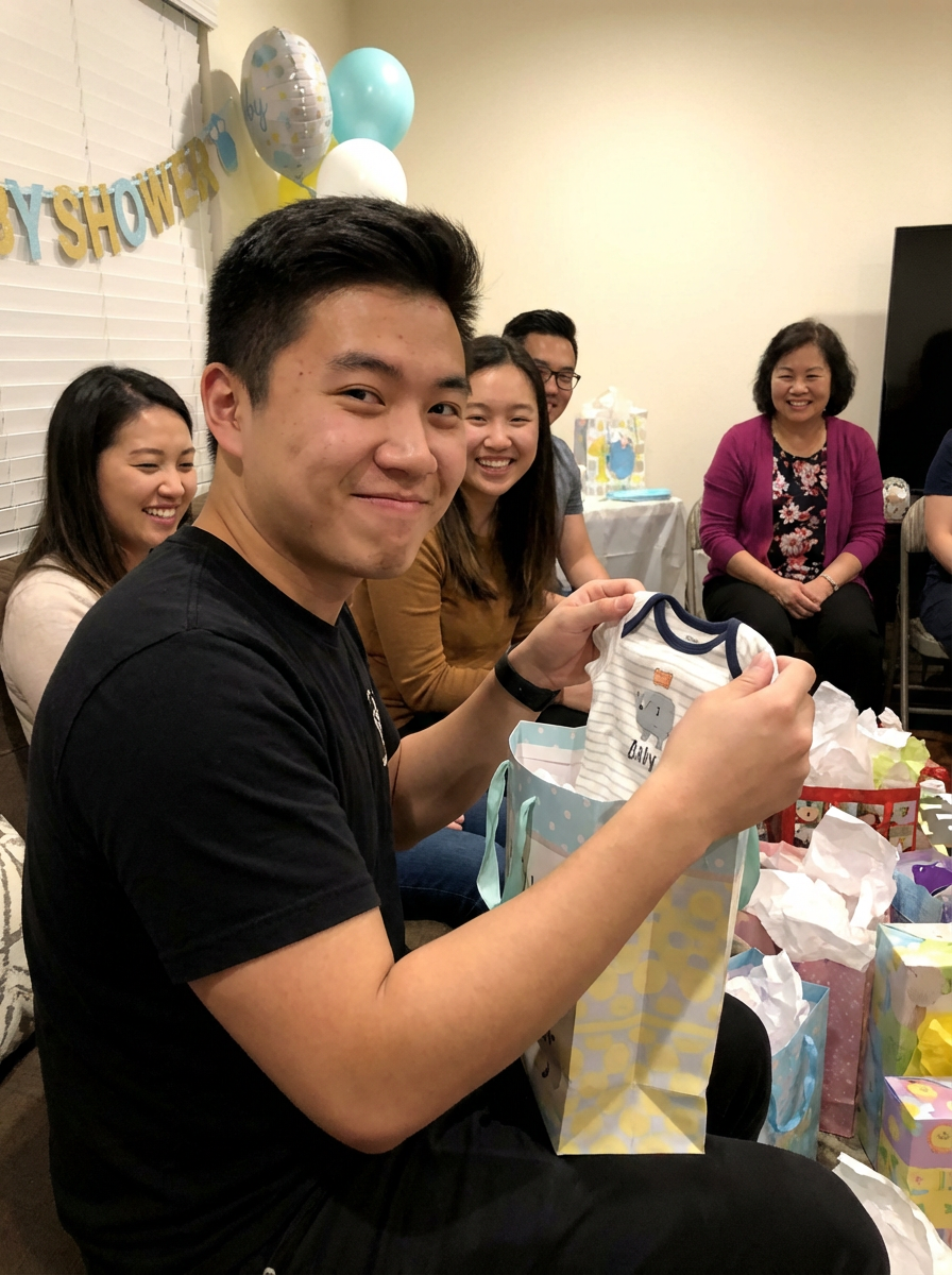 model opening baby shower gifts, cute baby items, surrounded by loved ones, joyful expression