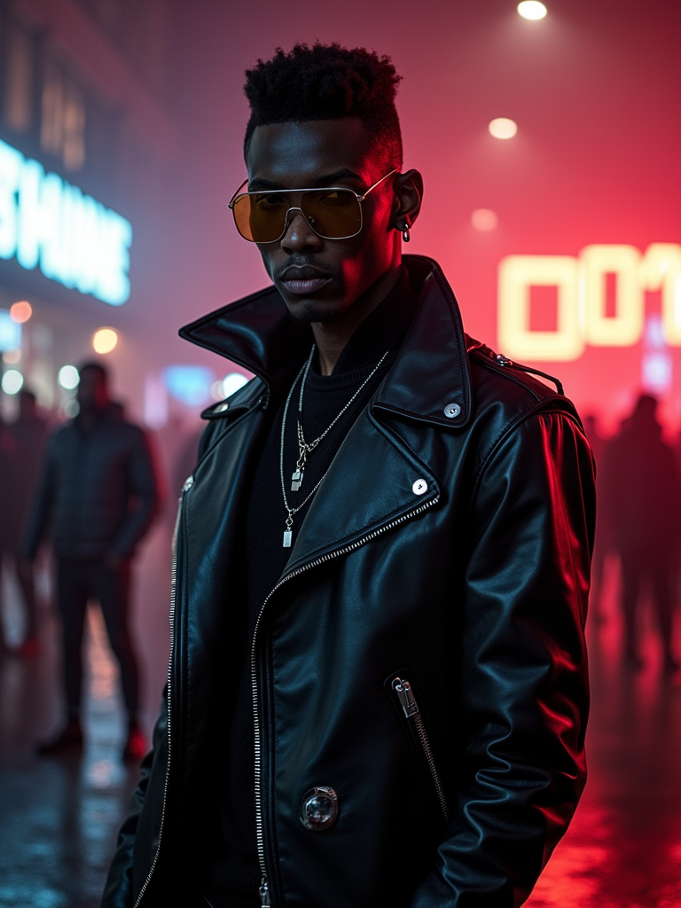 model outside techno party outside berghain night club in berlin at night. the model wears full leather outfit, futuristic techno design