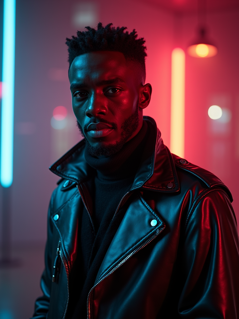 model outside techno party outside berghain night club in berlin at night. the model wears full leather outfit, futuristic techno design