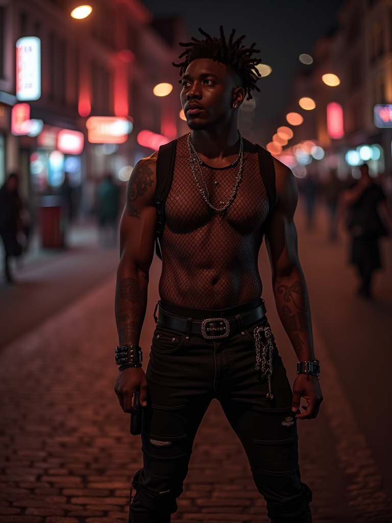 model outside techno party outside berghain night club in berlin at night. the model wears fishnet top, black jeans fishnet stockings, black boots. garter straps, bdsm harness, garter belts