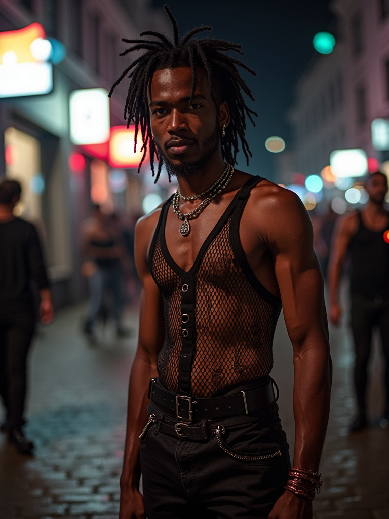 model outside techno party outside berghain night club in berlin at night. the model wears fishnet top, black jeans fishnet stockings, black boots. garter straps, bdsm harness, garter belts