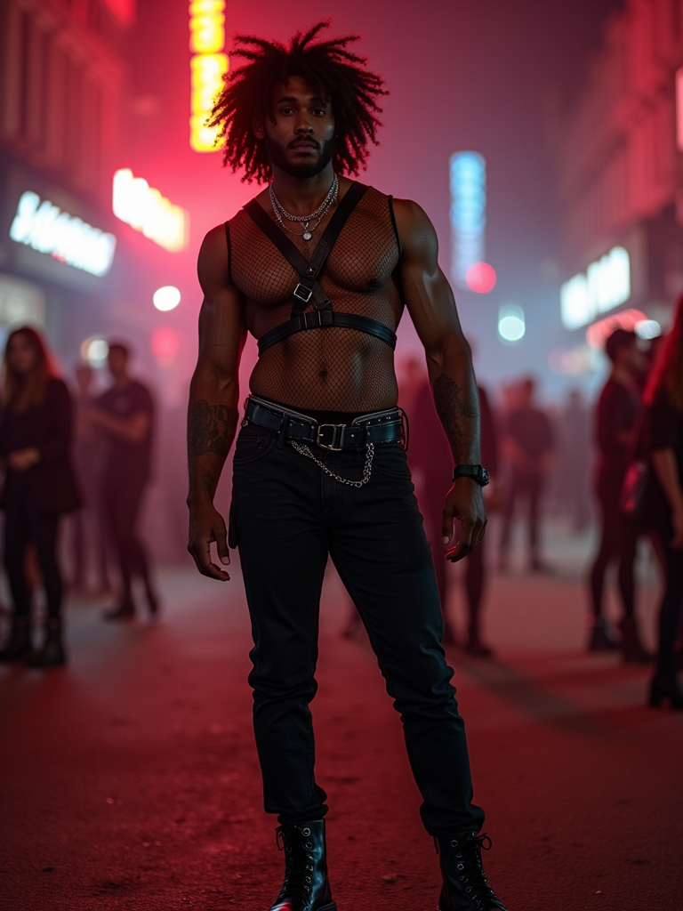 model outside techno party outside berghain night club in berlin at night. the model wears fishnet top, black jeans fishnet stockings, black boots. garter straps, bdsm harness, garter belts