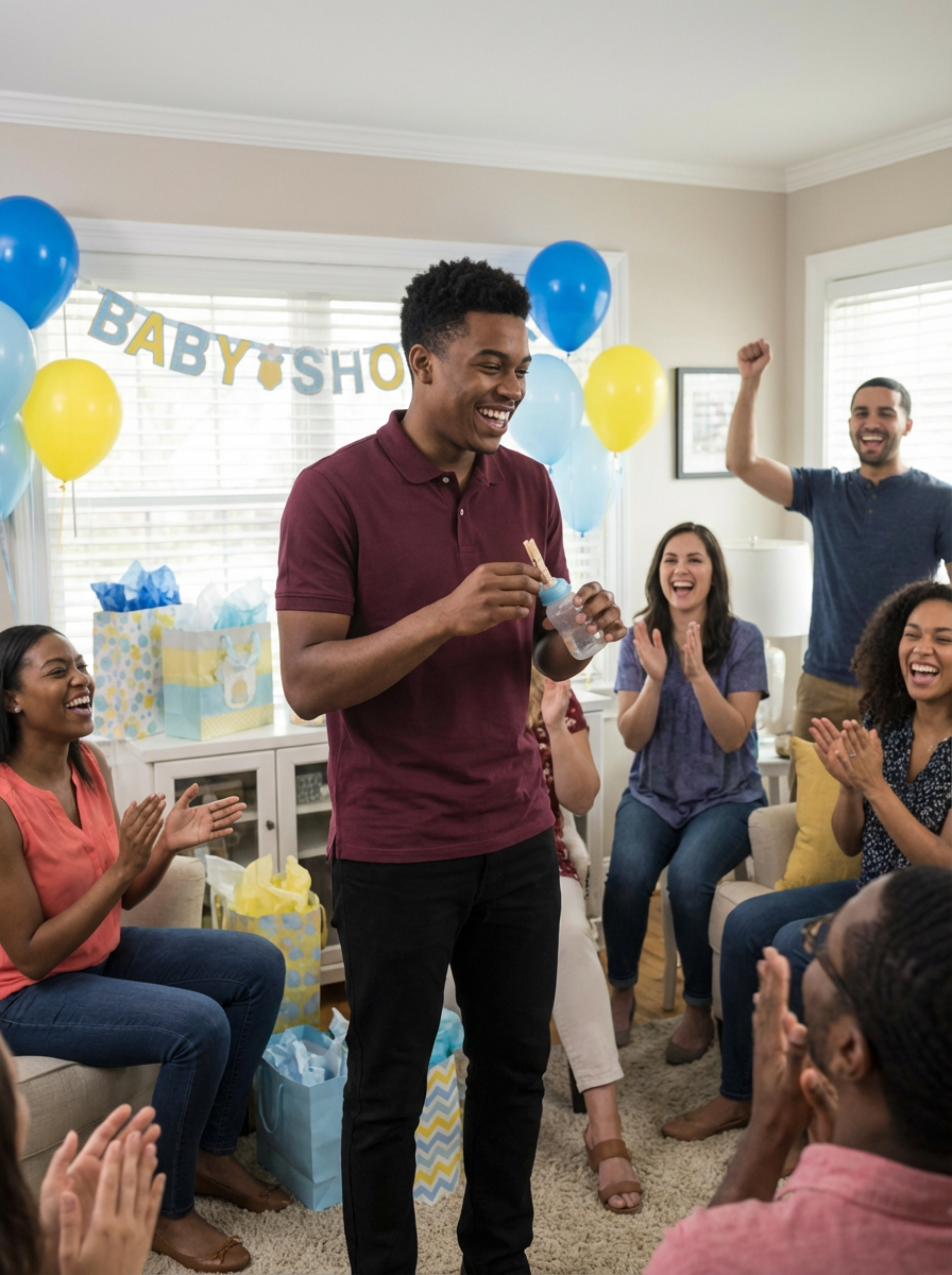 model playing baby shower games, fun party activities, guests laughing, festive atmosphere