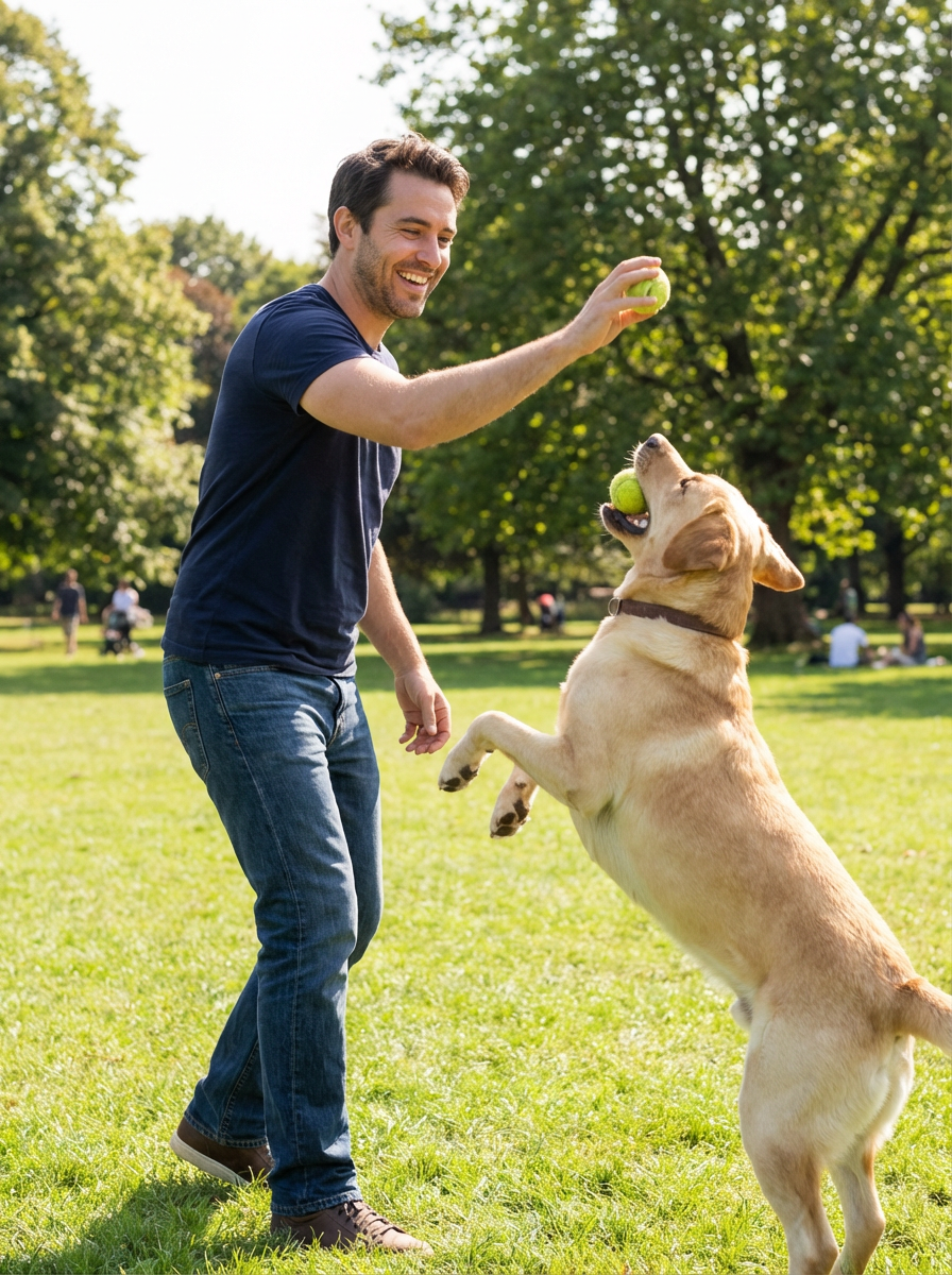 model playing fetch with happy labrador in sunny park, active outdoor scene, joyful expressions