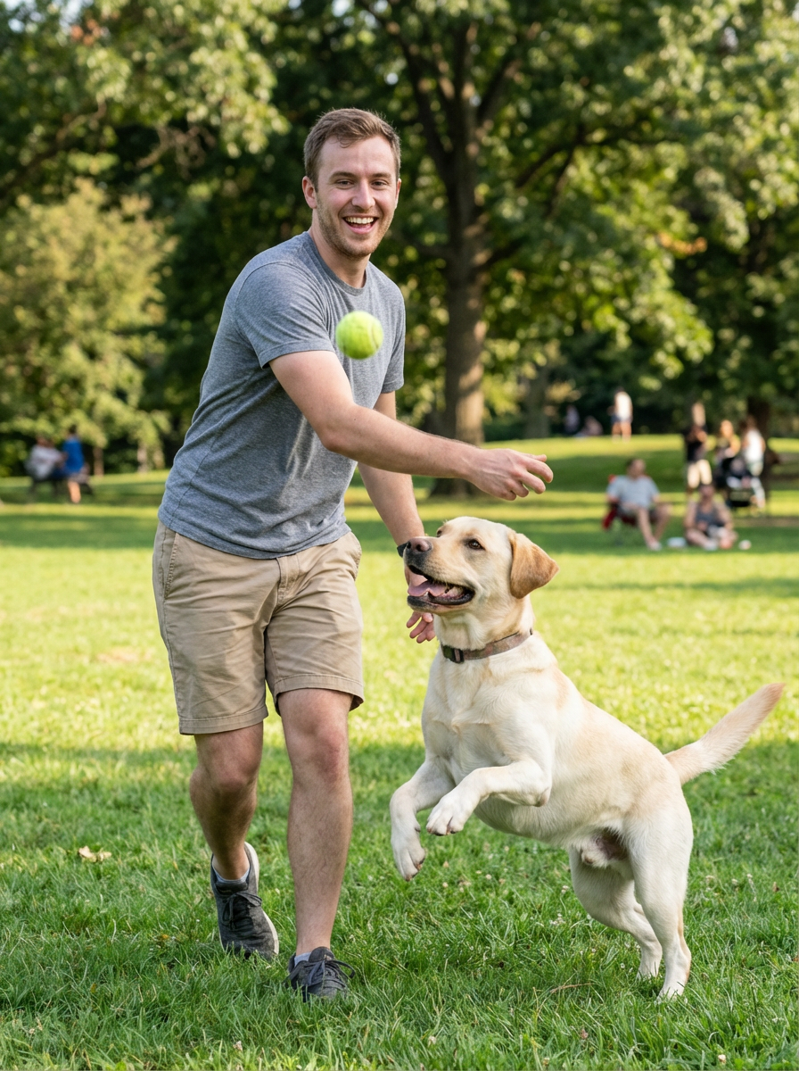 model playing fetch with happy labrador in sunny park, active outdoor scene, joyful expressions