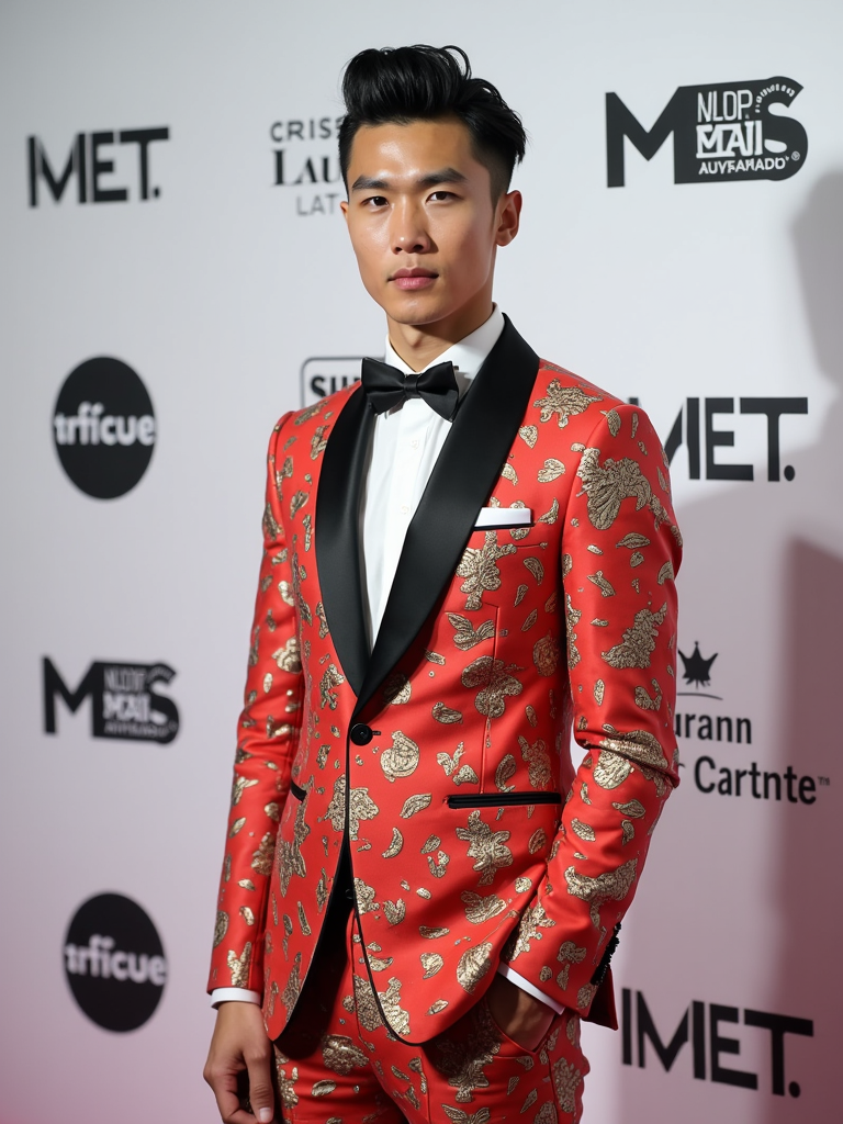 model posing for social media content at the Met Gala step-and-repeat, wearing a social media-ready ensemble with memorable features, iconic Met backdrop with event branding and sponsors