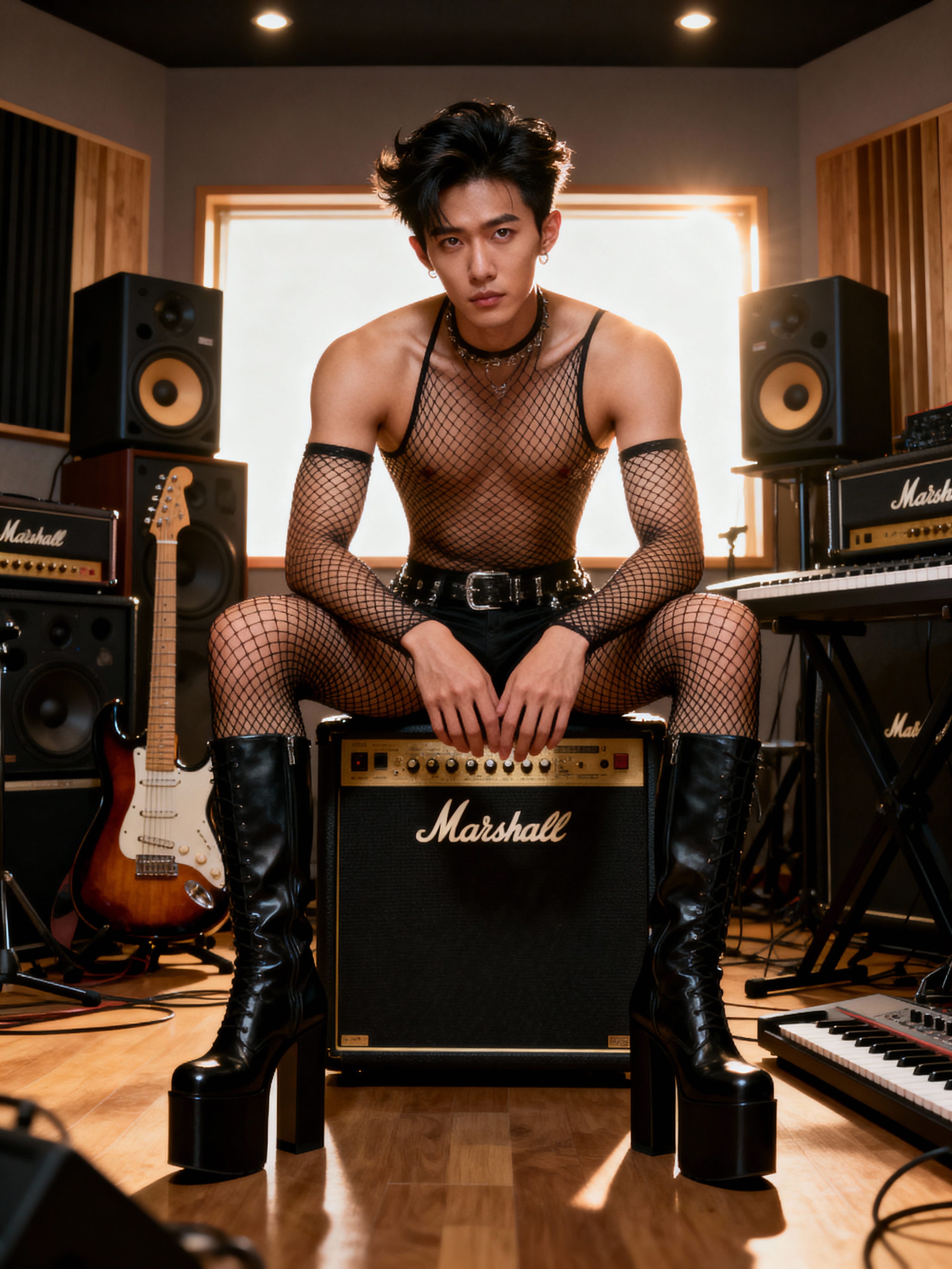model posing in a music studio surrounded by various speakers, a guitar, and a keyboard. She is sitting on a Marshall amplifier and is dressed in a revealing outfit consisting of fishnet attire and knee-high platform boots. Model look is complemented by their styled hair and a contemplative expression on her face. The lighting in the room highlights them and casts a glow that enhances the ambience of the studio setting. the photo emphasizes their exaggerated, idealized body shapes.