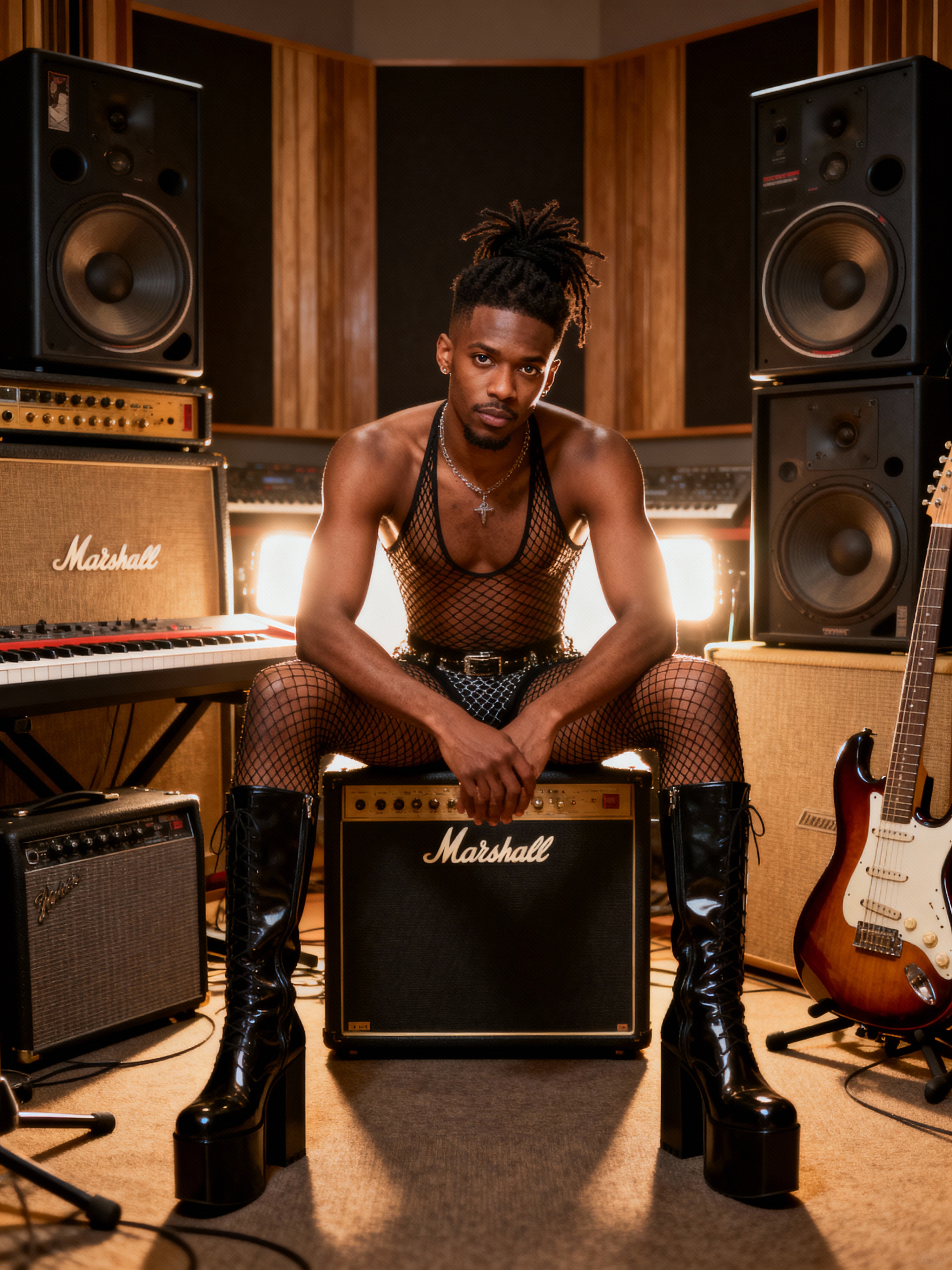 model posing in a music studio surrounded by various speakers, a guitar, and a keyboard. She is sitting on a Marshall amplifier and is dressed in a revealing outfit consisting of fishnet attire and knee-high platform boots. Model look is complemented by their styled hair and a contemplative expression on her face. The lighting in the room highlights them and casts a glow that enhances the ambience of the studio setting. the photo emphasizes their exaggerated, idealized body shapes.