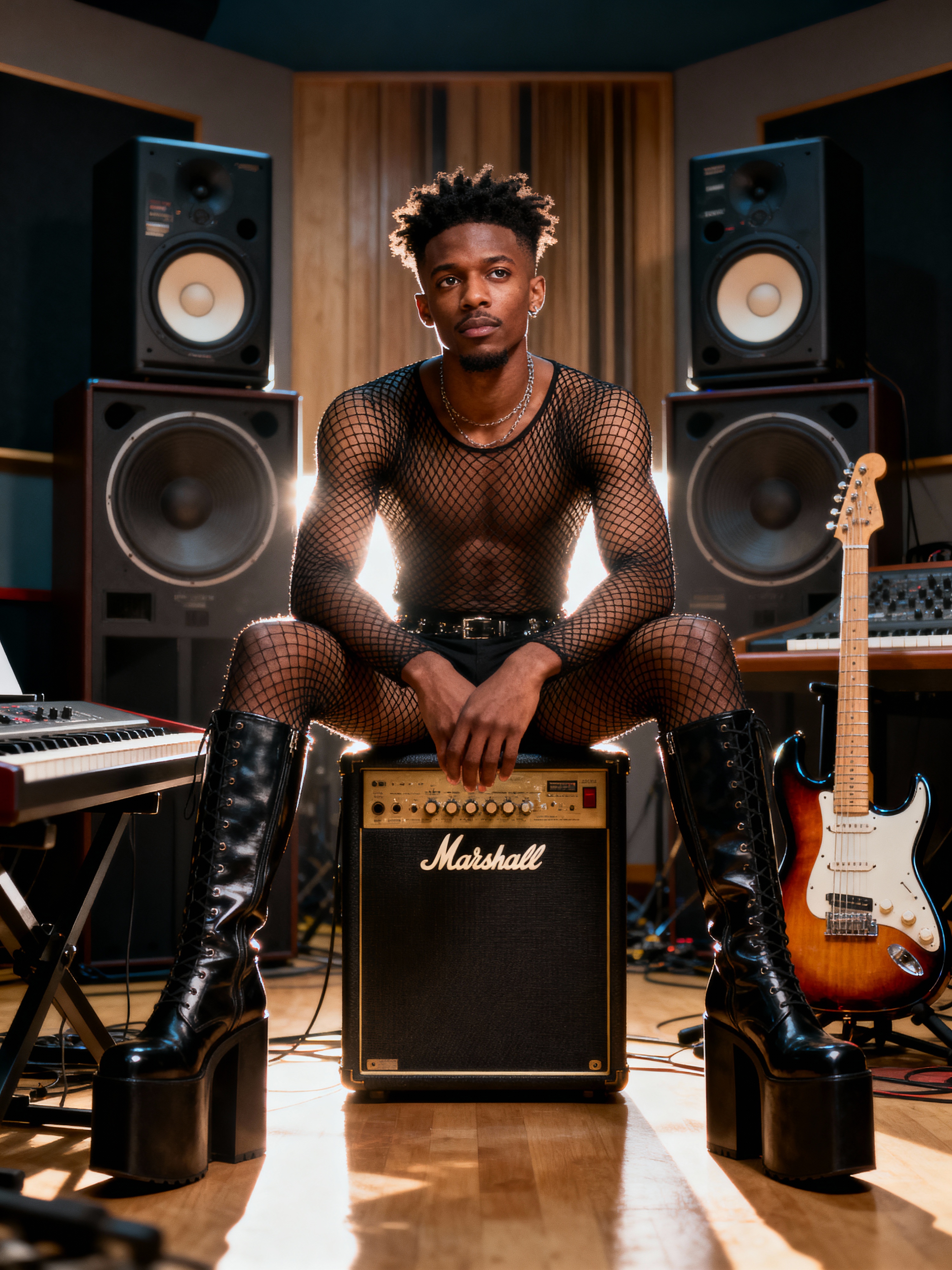 model posing in a music studio surrounded by various speakers, a guitar, and a keyboard. She is sitting on a Marshall amplifier and is dressed in a revealing outfit consisting of fishnet attire and knee-high platform boots. Model look is complemented by their styled hair and a contemplative expression on her face. The lighting in the room highlights them and casts a glow that enhances the ambience of the studio setting. the photo emphasizes their exaggerated, idealized body shapes.