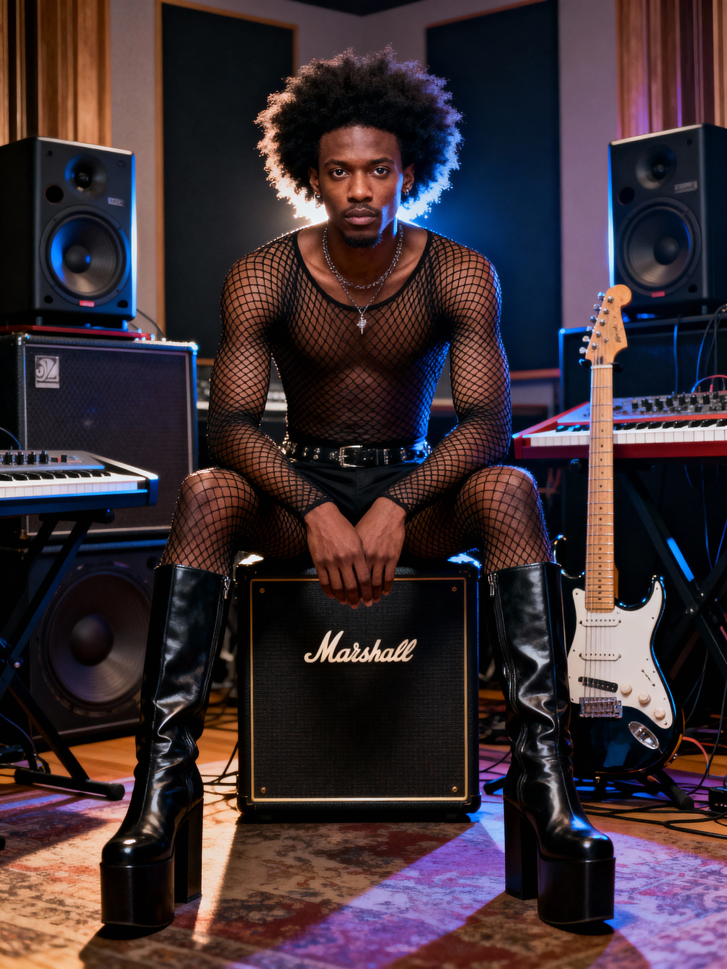 model posing in a music studio surrounded by various speakers, a guitar, and a keyboard. She is sitting on a Marshall amplifier and is dressed in a revealing outfit consisting of fishnet attire and knee-high platform boots. Model look is complemented by their styled hair and a contemplative expression on her face. The lighting in the room highlights them and casts a glow that enhances the ambience of the studio setting. the photo emphasizes their exaggerated, idealized body shapes.