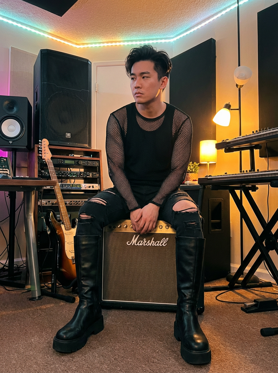 model posing in a music studio surrounded by various speakers, a guitar, and a keyboard. She is sitting on a Marshall amplifier and is dressed in a revealing outfit consisting of fishnet attire and knee-high platform boots. Model look is complemented by their styled hair and a contemplative expression on her face. The lighting in the room highlights them and casts a glow that enhances the ambience of the studio setting. the photo emphasizes their perfect body shapes.