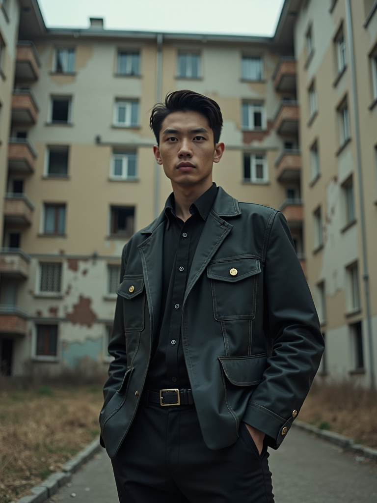 Related photosman wearing black gas mask in abandoned rusty Chernobyl.man in front of rusty bumper cars in abandoned overgrown amusement park in Chernobyl. wearing black boots and black pants.man posing in front of abandoned derelict Soviet era Russian block of 1950s flats. crumbling walls, fallen off tiles. in terrible condition. haunted atmosphere.a beautiful fashion charming dreamlike man with lv jewelry, character art, art by artgerm lau and wlop and and ilya kuvshinov and john singer sargent, hyperdetailed, 8 k realistic, symmetrical, frostbite 3 engine, cryengine, dof, trending on artstation, digital artman as 17th Century French Kinghandsome and stylish man showcasing a unique windowpane check suit in a navy blue color with a patterned shirt and a contrasting bow tie