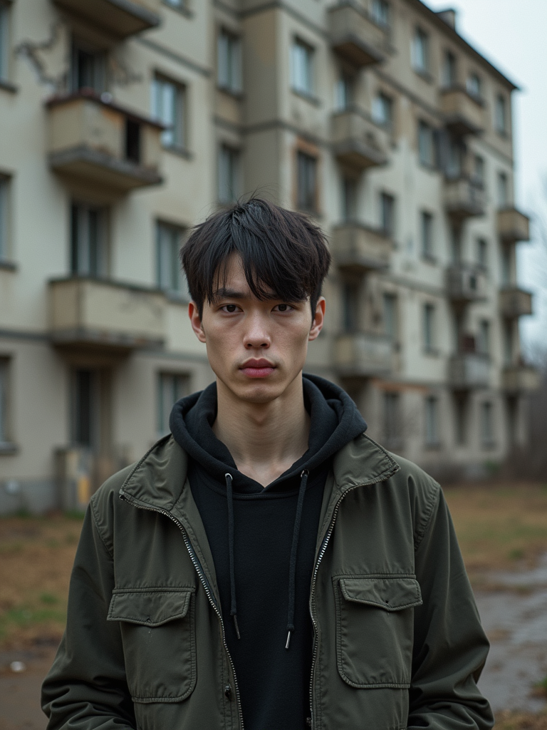 model posing in front of abandoned derelict Soviet era Russian block of 1950s flats. crumbling walls, fallen off tiles. in terrible condition. haunted atmosphere.